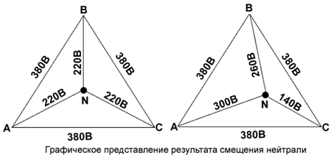 - замыкании фазы с рабочей нейтралью при отсутствии реакции защитного автомата. При возникновении признаков перекоса фаз, таких, как отключение или снижение мощности электрооборудование, мерцание ламп дневного света, тус