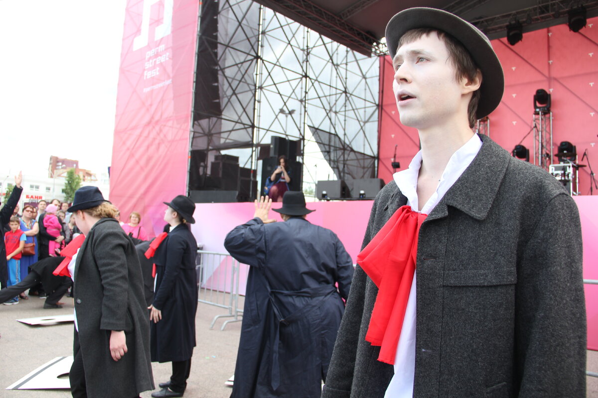 Я вышел на площадь, выжженный квартал надел на голову, как рыжий парик. Людям страшно - у меня изо рта шевелит ногами непрожеванный крик. Но меня не осудят, но меня не облают, как пророку, цветами устелят мне след. Все эти, провалившиеся носами, знают: я - ваш поэт. Как трактир, мне страшен ваш страшный суд! Меня одного сквозь горящие здания проститутки, как святыню, на руках понесут и покажут богу в свое оправдание. И бог заплачет над моею книжкой! Не слова - судороги, слипшиеся комом; и побежит по небу с моими стихами под мышкой и будет, задыхаясь, читать их своим знакомым. На моих фотографиях спектакль "Маяковский" на фестивале уличных спектаклей в городе Перми.