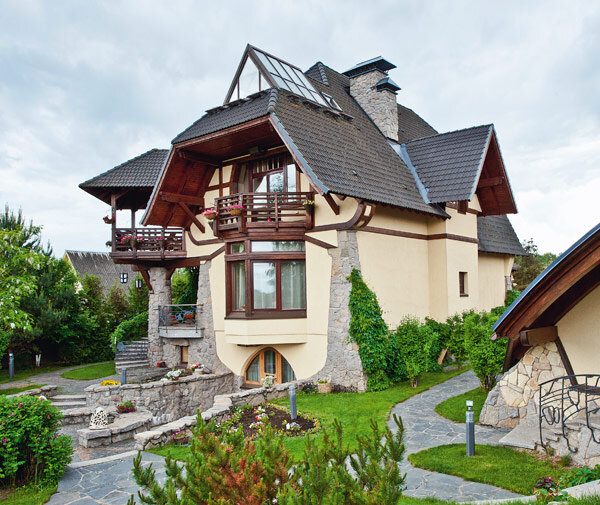 Главный жилой дом в составе подмосковной усадьбы создавался как рукотворное произведение искусства. В его интерьерах почти все выполнено на заказ. В отделке фасадов здания удачно сочетаются светлая штукатурка и натуральный камень — гранит. Архитектурой и интерьерами особняка занимались без спешки. Во время проектирования и строительства владелец уже жил на территории усадьбы в других постройках и мог себе позволить не торопиться с заселением, отдавая приоритет авторскому дизайну и высокому качеству исполнения. Изначально заказчику нравились дома Голландии — высокие, узкие, с фахверком на фасадах и кирпичными сводами внутри. Но постепенно эта идея трансформировалась в совершенно индивидуальный образ дома, где читаются некие европейские черты, но нет прямого копирования исторических и национальных стилей. Особняк размещен на участке таким образом, чтобы из основных помещений дневного пребывания, с веранды и балконов открывался вид на русло реки. В отделке фасадов здания удачно сочетаютс