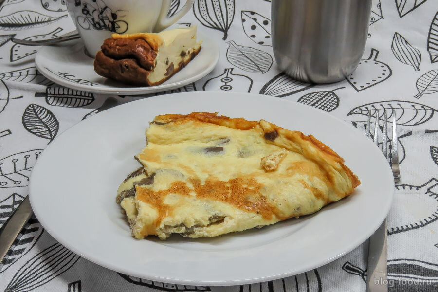 Добрый день! Сегодня отдохнем от восточно-азиатских блюд, вернёмся в Россию-матушку и сварганим простой омлет с грибами. Тут вешенки, но можно, естественно, использовать и шампиньоны. Продуктовый набор: Количество молока — стандартное для омлета. Измеряем половинкой скорлупы от яйца — сколько яиц, столько и половинок. Режем грибы: И слегка обжариваем на сливочном масле (именно на сливочном — это важно). Буквально минуту: В блендер закладываем яйца, молоко, тертый на крупной терке сыр, тимьян и солим по вкусу. Тщательно всё перемалываем и заливаем грибы: Доводим до кипения, ставим огонь на «чуть больше минимума», накрываем крышкой и идём заниматься утренними делами. Индикатор готовности — «вспухание» омлета (у меня на это ушло порядка пятнадцати минут): Теперь можно либо сразу раскладывать омлет по тарелкам, либо ещё пару минут подержать его под крышкой, чтобы образовалась корочка: Приятного аппетита!