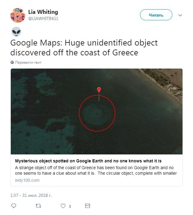 Пользователи интернета, в очередной раз разглядывая Google Earth, нашли интересную особенность на берегу Эгейского моря, а именно непонятный объект, похожий на космический корабль НЛО круглой формы, который таится на дне моря. Общественность активно обсуждает внеземное происхождение данного объекта. И не зря, ведь действительно, очень, очень похоже на правду. Однако, многие склоняются к тому, что это фундамент построенного когда-то дома, или же фундамент маяка, который мог быть на этом месте. Так же, таинственный объект вполне может быть причастен к пристани, построенной неподалеку. Правда, все это пока не более чем догадки, но истинна где-то рядом. Правильный ответ не заставит нас долго ждать, ведь местные дайверы пообещали отправиться в самое ближайшее время на исследование, чтобы разрушить все мифы и догадки, рассказав, что это на самом деле такое. А нам остается только ждать и верить в то, что это закончится как минимум интересно! Подписывайтесь на канал и поддерживайте нас, в