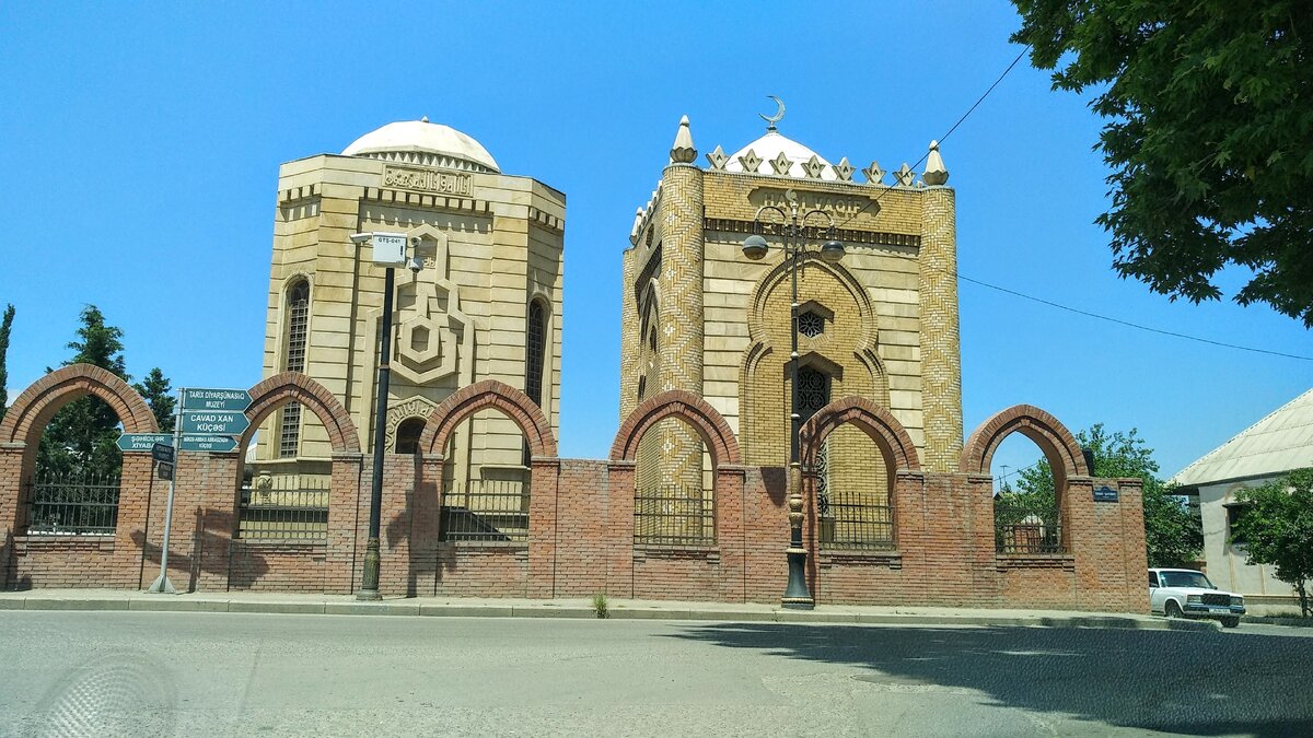 Настало время выехать в город, хоть нам и не очень хотелось оставлять тенистые ракетки. Прогулка оказалась довольно интересной. Чувствовалось, что мы в мусульманской стране, главным образом потому-что ни одной женщины на улице не было. И хотя я была одета в свободные брюки, все равно не могла отделаться от взглядов на себе. Архитектура очень приятная, я вообще люблю разные узоры, резные решетки, восточные мотивы. Даже урна была сделана в том же стиле, как-будто специально под ограду, стоящую рядом. Так же мы заметили, что строительство тут все же из кирпича и панельки, но обязательно сверху резная отделка, которая скрывает некрасивые фасады. Много разных скульптур, интересных фонтанов в этом городе. И все это сделано исключительно для своих жителей, на туристов особо не делают ставку. Главным образом это заметно по знанию языка, а точнее по незнанию языка. Если в Баку (в будущих статьях мы об этом расскажем) все разговаривают на русском языке, то в провинции слабо знают даже английски