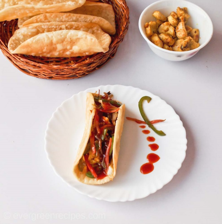 Время приготовления: 35-50 минут Порции: 4 Ингредиенты для маринада для курицы: Ингредиенты: Цыпленок (нарезанный) 400гр творог 3 ст.л. Нутовая мука2 ст.л. порошок красного перца чили 1 чайная ложка Поваренная соль по вкусу Куркума 1/2 чайной ложки Имбирь-чесночная паста 1 чайная ложка Гарам масала порошок 1 чайная ложка(индийская смесь специй) Ингредиенты для тако: Мука общего назначения 2 чашки Растительное масло2 столовые ложки плюс для фритюра Поваренная соль по вкусу или 1/2 чайной ложки Ингредиенты для начинки или салатной заправки: Лук 1 Морковь1/2 чашки стручковый перец1/2 чашки Капуста1/2 чашки соевый соус1 чайная ложка Уксус1 чайная ложка Перец порошок1/2 чайной ложки Поваренная соль по вкусу Зеленый лук2 ст.л. Растительное масло1 ст.л. соус чили для гарнира итальянские приправы для гарнира приготовление: 1. В миску, высыпать все ингредиенты, указанные в таблице выше"Ингредиенты для маринада" и хорошо перемешать. Отставьте его в сторону на 2-3 часа. 2. Разогреть сково