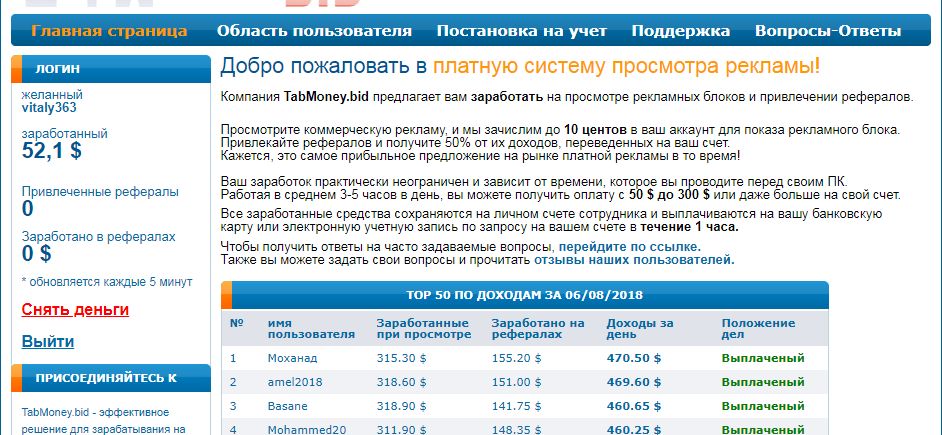 Очень легко заработать на просмотре рекламы в платной системе http://tabmoney.bid/2811664640273/ Зарегистрируйтесь и просматривайте блоки рекламы. Оплата 10 центов за один клик. 10 долларов можно набрать за 6-10 минут. Просмотрите коммерческую рекламу, и вам зачислят до 10 центов в ваш аккаунт для показа рекламного блока.