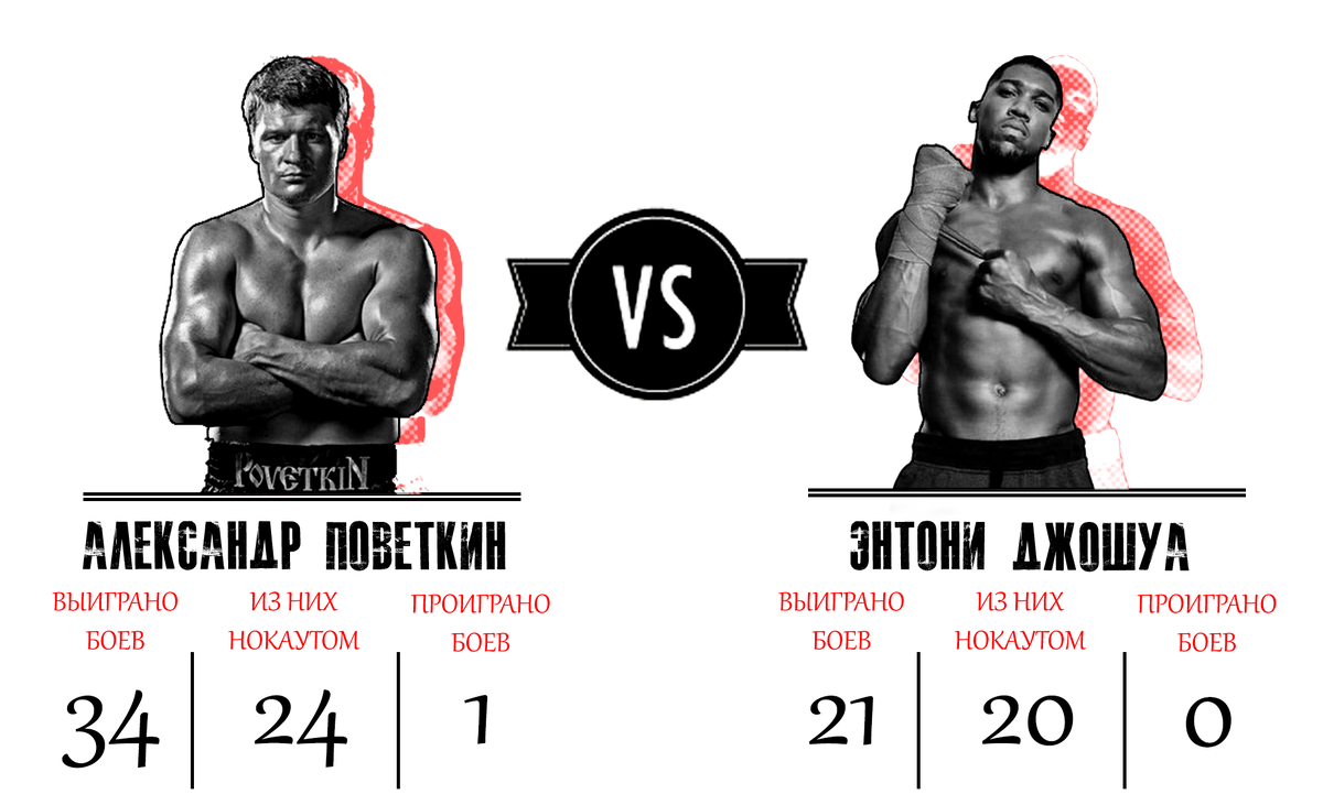 Бой запланирован 22 сентября на стадионе Уэмбли в Лондоне (Великобритания). По предварительным данным шансы нашего боксера на победу в поединке с англичанином неприлично малы. На данный момент коэффициенты букмекеров таковы: Джошуа - 1,10; ничья - 34; Поветкин - 9,3. Давайте рассмотрим характеристики обоих бойцов: