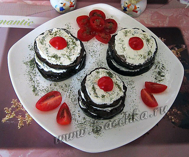 Используем по 3 кружочка баклажана на одну «башенку» - промазать крем-сыром с зеленью и чесноком, украсить помидорами черри и сушеной зеленью укропа.