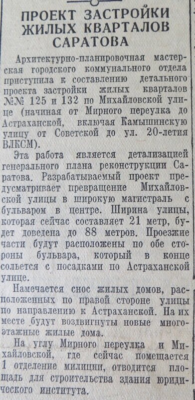 «Михайловская улица – одна из основных магистралей города, связывающая железнодорожный вокзал с центром. Через два-три года ее будет не узнать: она расширится, на ней вырастут многоэтажные жилые дома и административные здания с магазинами, ателье и парикмахерскими. Улицу украсит сквер».
