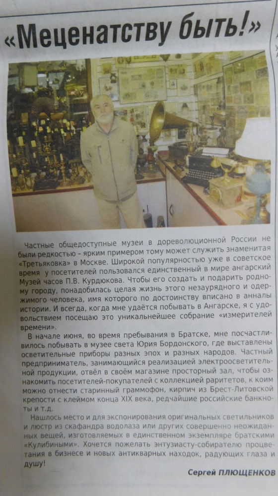 В начале лета краевед Сергей Плющенков(Чуна) побывал в Братском Музее Света,об этом мы сообщали на страницах журнала.А вчера нам передали районную газету,в которой Плющенков поделился впечатлениями о посещении частного собрания света в Братске.
