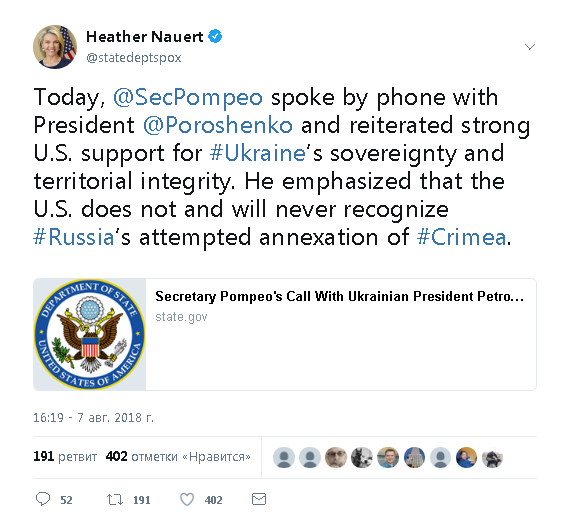 Госсекретарь Майк Помпео в телефонном разговоре дежурно поддержал Украину и призвал Президента Украины Петра Порошенко, чтобы Киев выполнил требования Международного валютного фонда (МВФ) Киева, об этом появилась запись на сайте Годепа США. "Сегодня Майк Помпео говорил по телефону с президентом Порошенко и подтвердил решительную поддержку США в отношении суверенитета и территориальной целостности Украины. Он подчеркнул, что США не и никогда не будет признавать российскую попытку аннексии Крыма, "- написала в своем Твиттере пресс-секретарь Госдепартамента Хизер Науэрт, ретвинув пресс-релиз Годепа. Отдельно нужно сказать, что Науэрт привела дежурные, повторяющиеся от заявления к заявлению речевки о поддержке Украниы, вероятно, не придав значения, настоятельной просьбе Помпео к Порошенко о безукоснительном выполнении всех требований МФВ. "Секретарь приветствовал недавнее принятие Украиной антикоррупционного судебного законодательства и Закона О национальной безопасности и призвал Украин