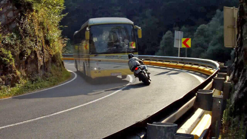 Всегда важно предусматривать достаточные боковые интервалы до дорожных отбойников, обочин без асфальта и до знаков дорожного движения. На узком, не просматриваемом повороте часто остается только одно решение – держаться справа и соответственно, ехать медленно.