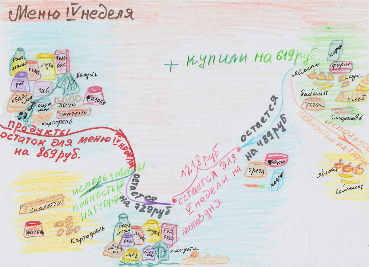 МЕНЮ ЧЕТВЕРТОЙ НЕДЕЛИ условно рассчитано на 1488 рублей,учитываются продукты, которые остались от меню ПЕРВОЙ недели, второй и третьей на 869 рублей. Из продуктов на 869 рублей, использованных продуктов в меню 4-ьей недели месяца и оставшиеся продукты на 5 неделю на сумму -729 руб. и полностью использованы продукты при расчете меню на 4-ью неделю на сумму - 140 руб. эти продукты, остались с меню 1-ой, 2-ой и 3-ей недели месяца.