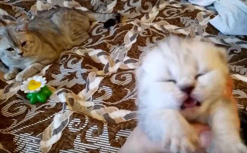 Видео с мамой кошкой и ее маленькими котятами, которые любят кушать и спать