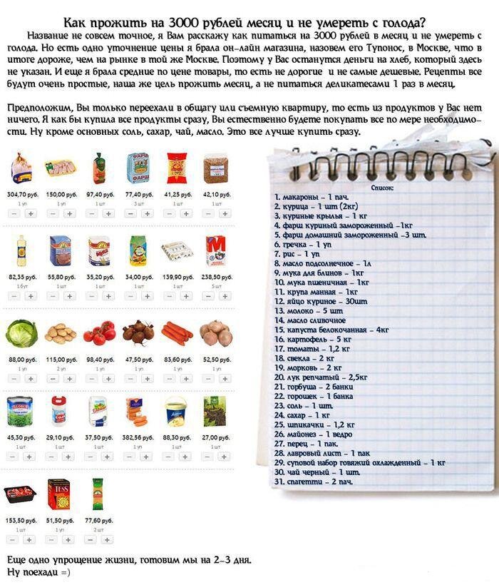 Автор данного меню показывает и подробно рассказывает, как можно протянуть месяц, если у вас всего 3000 рублей на продукты осталось (или остается). Этот пост написан видимо не от хорошей жизни и не для тех кто обеспечен. Для тех, кто хочет экономно расходовать свой бюджет, тоже почитать будет полезно Для начала мы приобретем продукты Приятного Аппетита