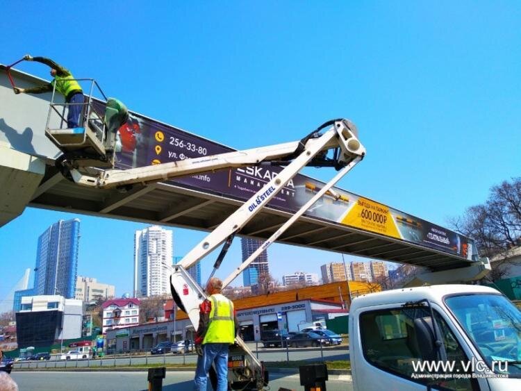 В краевом центре продолжается работа по приведению облика Владивостока в порядок Незаконно установленные билборды, рекламные щиты и штендеры демонтируются, также избавляют город и от самовольных рекламных растяжек, афиш на зданиях и объектах городской инфраструктуры. «Незаконная реклама не только не приносит доходов в городской бюджет, но и создает большие неудобства для автолюбителей и пешеходов. Хаотично размещенные объекты и плакаты порой закрывают обзор водителям и мешают людям свободно передвигаться по тротуарам и пешеходным зонам, на которых недобросовестные предприниматели расставляют рекламные штендеры», – отмечают специалисты. Работу по демонтажу незаконных рекламных конструкций в краевом центре производит мобильная бригада муниципального предприятия «Содержание городских территорий». Так, только за прошлый месяц с улиц города убрали 20 различных рекламных конструкций. На прошлой неделе под демонтаж попали еще 7 объектов, расположенных как на отдельных стойках, так и на фасад