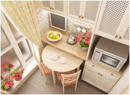 Статья на сайте Обычно перед тем, как выбирать столик, обращаем внимание на стены, потолок, имеющийся уже гарнитур, обои и окно. Ведь делая ремонт в таком крохотном помещении, хозяйки, прежде всего, хотят видеть его насколько это возможно просторным и комфортным во время приготовления еды. Многие хозяева часто пренебрегают обычными дизайнерскими фишками, что чревато неудобствами в дальнейшей работе. Маленькая кухня только выиграет из-за наличия в ней больших предметов мебели, и намного проиграет, если будет заставлена разными мелочами. Чем же руководствуются профессионалы, подбирая столик в такую кухню? 1) Форма стола должна соответствовать форме помещения. 2) Можно ли использовать целый стол с ножками или же удовлетвориться складным вариантом. 3) Стол нужен на постоянной основе или же его можно спрятать. 4) Из чего сделать столешницу и правильно подобрать цвет. 5) Где разместить стулья, и можно ли вместо них расположить диванчик. Какую выбрать форму Круглый столик, стоящий в уг