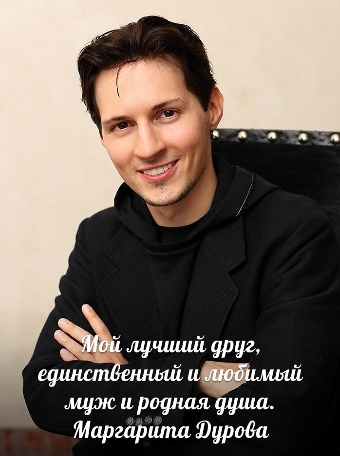 П.с.: Ты самая красивая жена, восхитительная и грамотная супруга, мое отражение, моя музыка, моя родная душа, самая талантливая ведущая и ты будешь самой лучшей матерью нашим детям. Маргарита ежедневно выкладывает посты о своей любви к Паше, зовет его домой. А также пишет от его имени себе стихи и признания в любви. Павел Дуров , моя единственная супруга, мы взаимно любим друг друга, мы одно ц