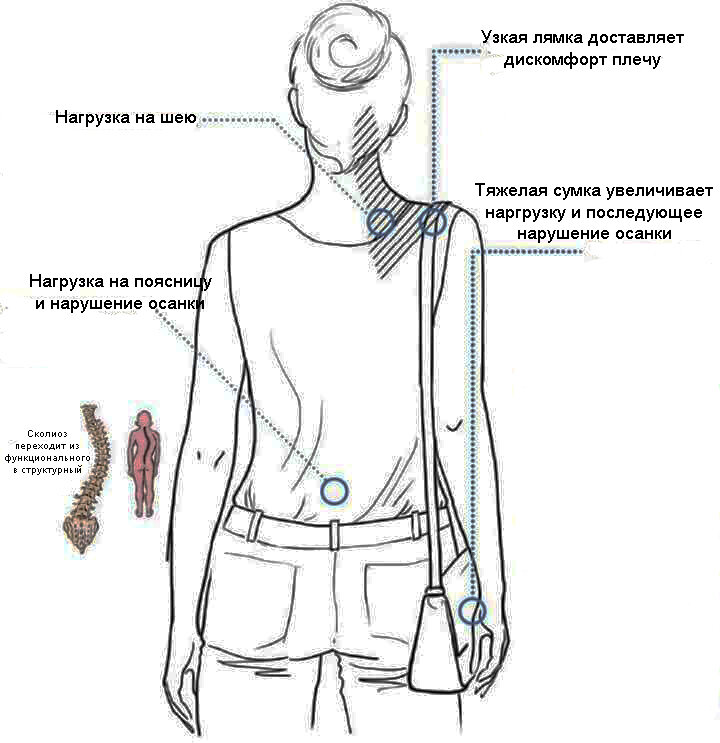 Девушки очень любят выглядеть красиво. И не менее трепетно они относятся к выбору аксессуаров. Но бывает, что модные тенденции не всегда оказывают полезное воздействие на здоровье. Например, большая сумка с ремнем на плечо может стать причиной целого комплекса проблем с позвоночником, начиная от мышечного спазма и заканчивая сколиозом. Специалисты рекомендуют носить сумку в опущенной руке и следить, чтобы вес вашей ноши составлял не более 3 кг. Желательно распределять вес равномерно на обе руки. Что происходит если мы носим тяжелую сумку на одном плече: Меры по защите осанки: Все материалы авторские, использование возможно только с согласия автора. Поддержите лайком и репостом :) И приходите снова на мой канал, буду рада вашим откликам Вконтакте, на Фейсбуке и инстаграме (ссылки есть на главной странице канала).
