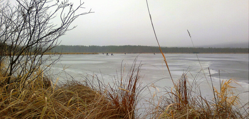На льду маячили три фигуры"пингвинов", значит на лёд идти можно. Крадучись вдоль берега пробираюськ небольшому заливу, где летом любят шнырять окуни с щурагаями. Подо льдом в том месте от силы метр, дальше идти не рискнул, хотя рыбачки, что сидели поодаль свободно передвигались в поисках полосатого. Ну да ладно у меня интерес спортивный за трофеями пойду с гарантией без купания в ледяной воде.