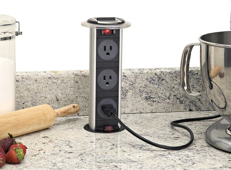 Сколько же розеток должно быть на современной кухне? Ответ: "Много". А если более точно, то для бесперебойной работы на 20% больше, чем кухонных гаджетов. Кроме обычных розеток, расположенных на стене, существуют и другие - выдвижные блоки, которые скрыты или встроены. Такой выдвижной блок хорошо размещается в столешнице, тумбе или навесном шкафу. Блок удобен тем, что его проводка практически спрятана, что наиболее актуально в семьях с маленькими детьми. Встроенные розетки могут быть вертикальными (они выдвигаются из шкафа или тумбы, путем нажатия на кнопку) или горизонтальными (наиболее практичны в эксплуатации и открываются нажатием края крышки). К выдвижным розеткам подключается мелкая бытовая техника, которая не работает постоянно. На сегодня это, пожалуй, самый современный вариант удлинителя. Для кухни может потребоваться 2 или 3 таких блока. Монтировать эти розетки довольно просто: просверлив в столешнице отверстие (диаметром, в зависимости от размера блока, для вертикальной мо