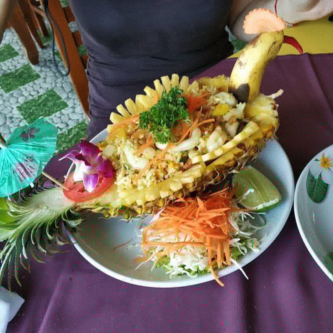 В Таиланде очень вкусная и разнообразная кухня, безусловно много острой еды, так как при такой жаре острая еда помогает не заболеть кишечными заболеваниями. Что стоит попробовать и сколько это стоит? 1). Пад-тай- жареная лапша может быть с курицей или морепродуктами, готовится преимущественно на улице в "макашницах", очень вкусное и сытное блюдо которое непременно стоит вашего внимания. Стоит 160 рублей за большую порцию. 2). Жареное мороженое-знаменитое тайское мороженое, которое готовится на основе молочной смеси и фруктов. На самом деле это мороженое готовится на ледяной поверхности и получается очень нежным, фруктовым с ярким насыщенным вкусом. стоит 160 рублей. Можно кушать вдвоем, так как порция огромная. 3). Банана блин-вкуснейшие блины сделанные прямо в уличных "макашницах" на основе рисового блинчика с разными начинками-фрукты, шоколад, сыр. Этот блинчик никого не оставит равнодушным. Стоит 100 рублей. 4). Рис в ананасе-яркий, сочный, спелый вкус ананаса в сочетании с рисом