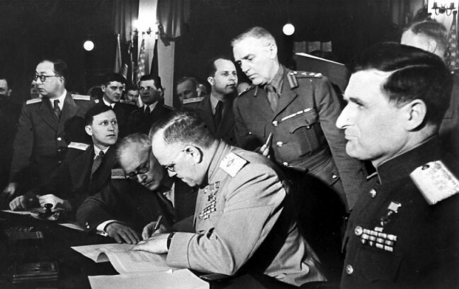 Самое удивительное заключается в том, что Германия капитулировала дважды. О том, какая из них настоящая общественные мнения России и Запада расходятся. Первый раз подписание исторического документа произошло 7 мая во французском городе Реймсе в штаб-квартире Союзных экспедиционных сил. Повторно Акт о капитуляции Германии был подписан спустя сутки в ночь с 8 на 9 мая 1945 года в Карлхорсте, райное Восточного Берлина. Кроме этого капитуляция отдельных частей Вермахта произошла в Северной Италии, Нидердандах, Дании и на Северо-западе Германии значительно раньше подписания официального Акта о капитуляции всей страны. Не удивительно, что на Западе признают «французскую» капитуляцию 7 мая, тогда как в России большим авторитетом пользуется капитуляция, подписаная в Берлине с 8 на 9 мая. Как ни странно, но в данном случае с юридической стороны оба документа имеют равную юридическую силу, но совершенно разный политический вес.Следуя букве закона, как 7 мая, так и 8-9 мая 1945 года Германия капитулировала перед представителями всех трех стран союзниц СССР, США и Великобритании. На подписании документа в Реймсе свою подпись поставили представитель Ставки Верховного Главнокомандования при командовании союзников генерал-майор И.А. Суслопаров, от англо-американской стороны документ подписал генерал-лейтенант армии США Уотер Бедлл Смит. Германскую сторону представил начальник оперативного штаба Верховного командования германской армии генерал-полковник Альфред Йодль. Кроме того капитуляцию завизировал заместитель начальника Штаба национальной обороны Франции бригадный генерал Франсуа Севез. Тем не менее, несмотря на появление долгожданного документа об окончании войны, в Москве были крайне не довольны самой процедурой его подписания. Мало того, И.В. Сталин отправил И.А. Суслопарову телеграмму с запретом подписания данного документа, но опоздал. Когда телеграмма была доставлена адресату, капитуляция уже была подписана всеми сторонами. Правда, проницательный Иван Александрович Суслопаров, внес в документ небольшое дополнение, гласящее, что если одна из сторон захочет переподписать документ это должно быть сделано. В тот же день данное предложение поступило от советской стороны по распоряжению И.В. Сталина. Второй раз Акт о Капитуляции Германии был подписан в Берлине. На этот раз состав подписантов оказался более представительным. От СССР капитуляцию принял маршал Г.К. Жуков, от англо-американских сил заместитель Главнокомандующего союзными экспедиционными силами маршал Артур Теддер. С Германской стороны Акт о капитуляции подписали генерал-фельдмаршал, начальник Верховного командования Вермахта Вильгельм Кейтль, представитель Люфтваффе генерал-полковник Штумпф и представитель кригсмарине адмирал фон Фридебург. При этом в Лондоне и Вашингтоне остались крайне недовольны повторным подписанием документа. Чтобы выразить свое отношение к данной процедуре вместо Дуайта Эйзенхауэра, который лично собирался подписать повторную капитуляцию, в Берлин, был отправлен его заместитель. Тем не менее, с точки зрения международного права обе капитуляции Германии имеют одинаковую силу.
