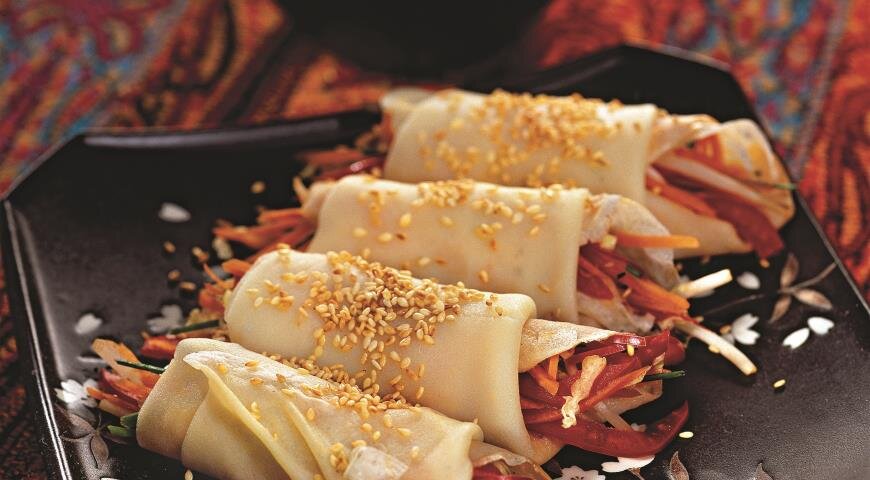 По лунному календарю двадцать восьмой день от новолуния имеет символ -Лотос и считается хорошим во всех смыслах. Его энергетика гармонична и несет в себе свет и радость. 28-ой день хорош для начинания новых дел, передачи важной информации, ремонта и строительства. И новое дело рекомендуется начать на голодный желудок. Ну, или на желудок, чуть наполненный каким-нибудь несложным блюдом, легким и изящным. Телятина под пивным соусом вряд ли подойдет, а китайские рулетики в этот день могут быть самыми желанными. Начните с тонких лепешек, похожих на блинчики. Всего полстакана муки просейте в подходящую посуду и добавьте соль по вкусу. Холодную воду осторожно влейте в муку, постоянно помешивая эту смесь и доведя ее постепенно до консистенции жидкой сметаны. Печем блинчики тонкие насколько это возможно на подсолнечном масле. Блинчики должны быть хорошо пропечены, но не сильно зажаристы. Повторите процедуру 8 раз. Всего получится 9 блинов, каждый из которых нужно разрезать пополам. 100 грамм