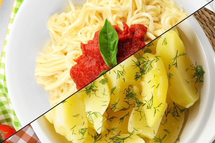Углеводы, в зависимости от скорости всасывания, делятся на быстрые и медленные. Быстрые углеводы — это все сладкое: глюкоза, фруктоза, сахароза. Вызывают подъем сахара и инсулина в крови, быстро превращаются в жиры. Медленные углеводы (крахмалы), содержатся в макаронных изделиях, картошке, крупах, хлебе, не создают скачков сахара и являются для нас самым качественным и правильным «топливом». Но помимо углеводов в макаронах и картофеле есть и другие переменные, так или иначе влияющие на организм. Поэтому мы взвесим все «за» и «против». Польза или вред для здоровья? Макароны выигрывают по содержанию витамина Е, но они, в отличие от картофеля, совершенно не содержат витамин С. Если оценить, сколько полезных веществ мы получаем в расчете на одну порцию (200 г) одного и другого продукта, в лидеры выходит картофель. У него выше насыщенность минеральными веществами и витаминами. Что не навредит фигуре? Рассматривая эти продукты в контексте пользы для фигуры, неправильно говорить, что какой-