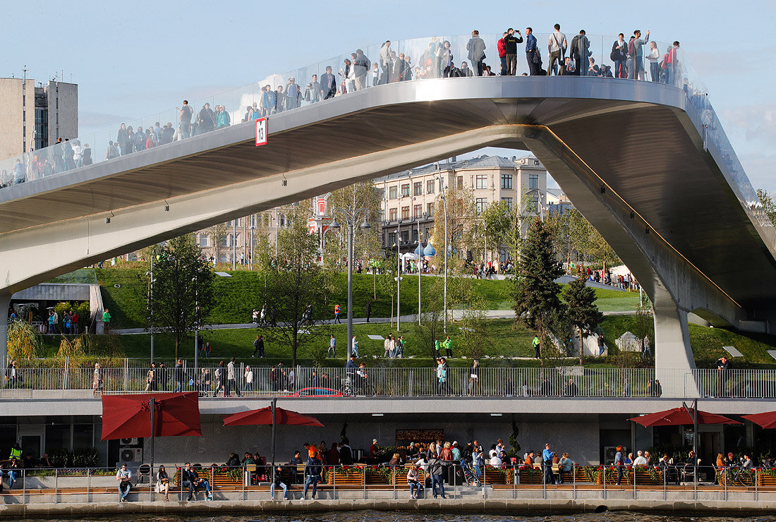 Открытый с огромной помпезностью и величественными одами новому месту отдыха москвичей парк «Зарядье» оказался, мягко говоря, далек от идеала. На берегу Москвы-реки, в непосредственной близости от Кремля, в одном из самых живописных мест прекрасного и любимого города раскинулся уголок уныния. Дикорастущие зеленые насаждения вперемешку с сорняками под огромным куполом совсем не похожи на ухоженные растения ботанического сада. Выгоревшие газоны, откровенные куски грязи посреди зеленой травы и «пуп Земли» на вершине не придают парку нужного колорита. Ледяная пещера больше напоминает огромный холодильник, а «парящий мост»…видимо для него все вокруг и создавалось. Одним словом, абсолютно не воодушевил ты нас, «Зарядье». Мнение автора может отличаться от мнения читателей. На постановочных фото парк выглядит красиво. Фото: Интерфакс, Интернет