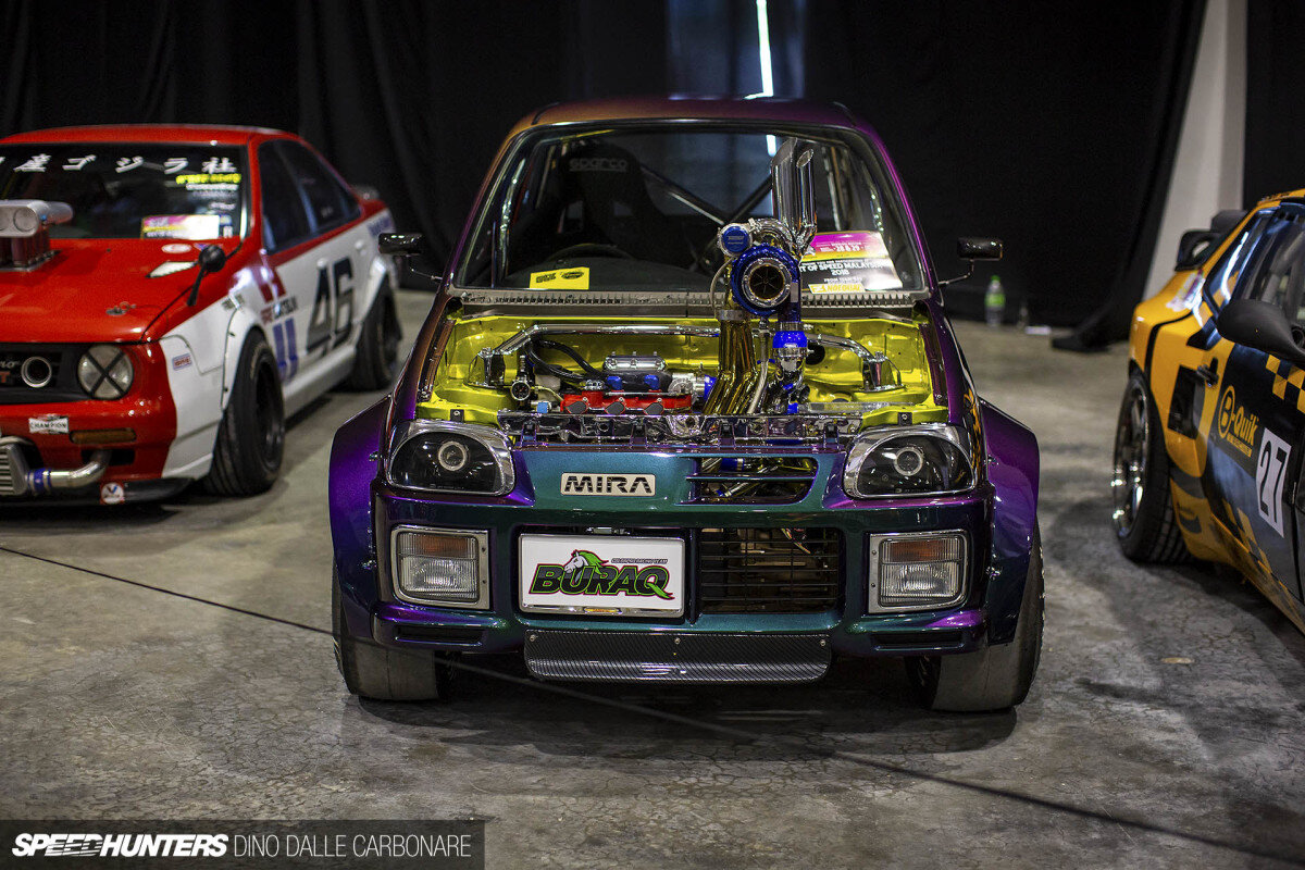 Эта машина, пожалуй, произвела на меня наибольшее впечатление из всех, что я видел на Art Of Speed в этом году. Небольшой автомобильчик, который пытается прыгнуть выше головы. В ней выражается все стремление отчаянных парней выделиться на малазийской авто-сцене. Да, торчащая на пол-метра из машины турбина будет привлекать внимание. Но хочу подчеркнуть, что здесь это не просто понт. Двигатель, например, уже не 660 см³, а полноценный литр. Благодаря металлическому блоку, который владелец отлил самостоятельно. Фрезернутая головка сочетается с подобранными для правильной степени сжатия 80-мм поршнями. Все сделано для того, чтобы через улитку HKS GT «дунуть» в мотор 3 бара, что в сочетании с отсечкой на 10 000 об/мин должно обеспечить 400 л.с. Так считает владелец. Насколько это возможно — пока вопрос открытый, но я надеюсь, что так оно и будет. Еще он планирует запускать эту трехцилиндровую жужжалку на чистом этаноле, чтобы выиграть еще пару лошадиных сил и уменьшить детонацию. Исполнени