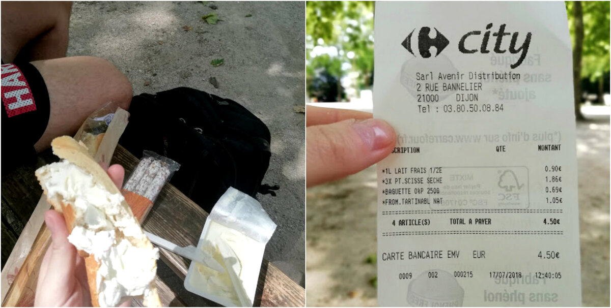Во Франции мы проехали Лион, Дижон, Париж, Реймс и Страсбург. Сейчас мы готовы поделиться полезной информацией о ценах, чтобы вы могли понять, сколько денег вам нужно на еду :) По канонам бюджетного питания все 5 дней во Франции мы покупали продукты только в супермаркетах: перекусывали или готовили сами. В основном, в Lidl и Carrefour. Ниже чек из Carrefour — примерно такой рацион у нас был в путешествии, когда не было возможности готовить у хостов. Позиции в чеке — наш типичный обед-перекус: Молоко — самое недорогое — 0,90 евро 4 сосиски — 1,86 евро Багет — 0,69 — тоже самый дешевый Мягкий сыр — 1, 05 евро Нектарины — 4 евро Абрикосы — 5 евро Кексы, мягкие вафли — 1-2,6 евро Колбаса в нарезке, сосиски — 2-3 евро Колбаса — 3-4 евро Макароны — около 1 евро Кетчуп — 2 евро Молоко продают по 0,5 литра и 1 литру — 0,70-1,5 евро Сок — 1,5 евро Еще в магазинах стоят вот такие аппараты. Хлеб в нарезке — 0,80 евро Еще в отделе фруктов/овощей можно увидеть АЛОЭ
