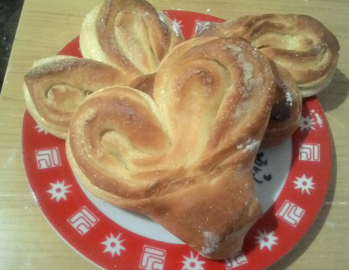 Формируем булочки. От теста отрываем кусочек, раскатываем в пласт, смазываем растительным маслом, посыпаем сахаром равномерно по всей поверхности, сворачиваем рулетиком, складываем пополам, надрезаем и раскрываем в виде сердечка. Булочки выкладываем на противень, даем подойти 10-15 минут и отправляем в духовку разогретую до 180 градусов на 20-30 минут