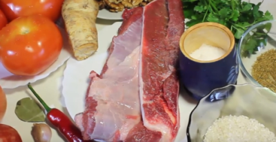 Мясо хорошо промойте и нарежьте на кусочки. В кастрюлю налейте 3 литра воды, положите туда мясо и поставьте на огонь вариться. Обязательно нужно снимать пену, которая будет образовываться.