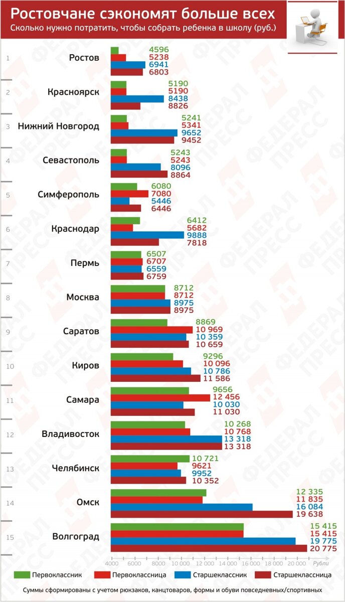 Мы составили стандартные школьные наборы для первоклассников и старшеклассников и сравнили цены на них в пятнадцати городах России: Москве, Ростове-на-Дону, Красноярске, Нижним Новгороде, Севастополе, Симферополе, Краснодаре, Перми, Саратове, Кирове, Самаре, Владивостоке, Челябинске, Омске и Волгограде.