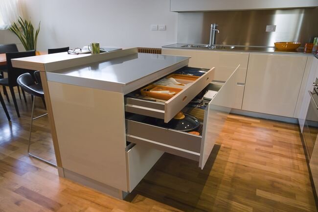 Слишком узкий проход будет мешать как свободному перемещению хозяев по кухне, так и выдвижению ящиков, в которых хранятся столь необходимые в быту вещи.