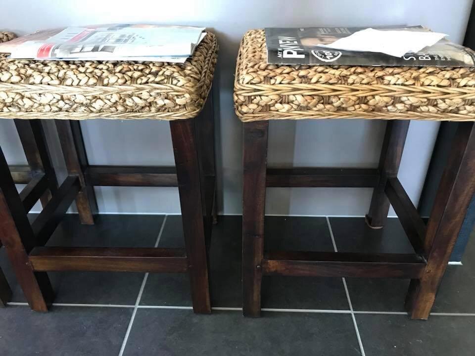 На фотографии изображены два коричневых стула, расположенных близко друг к другу, с несколькими журналами, лежащими сверху.