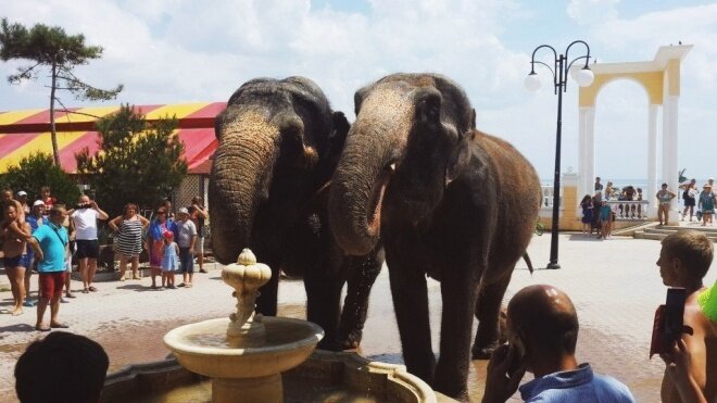Животные из труппы гастролирующего цирка каждый день ходят на море Двух индийских слоних Дженни и Магду, актрис циркового шоу на гастролях, можно встретить на этой неделе на улицах и пляже Евпатории. Как сообщают в паблике социальной сети В Контакте "Евпатория Подслушано и Подсмотрено", жители и гости города очень рады таким встречам. Даже мэр Евпатории Андрей Филонов выложил на своей личной странице сюжет о купании слонов.