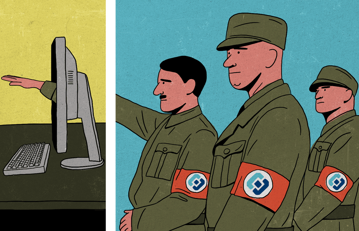 Статья 20.3 — отличная возможность почувствовать себя персонажем произведений Франца Кафки, когда тебя обвиняют в чем-то, прямо противоположном твоим истинным намерениям. Пользователь «ВКонтакте» из Архангельска заплатил 1000 рублей за то, что сопроводил новость о нападении «Офицеров России» на выставку фотографий Джока Стерджеса «Без смущения» снимком с похожих акций фашистов в Германии 1930-х против «дегенеративного искусства» и подписью «История ничему не учит». В Северодвинске местного жителя привлекли к ответственности за репост десятиминутного видео «Победобесие», в котором критикуется использование войны в целях современной государственной пропаганды и превращение 9 мая из дня скорби в день ура-патриотизма.