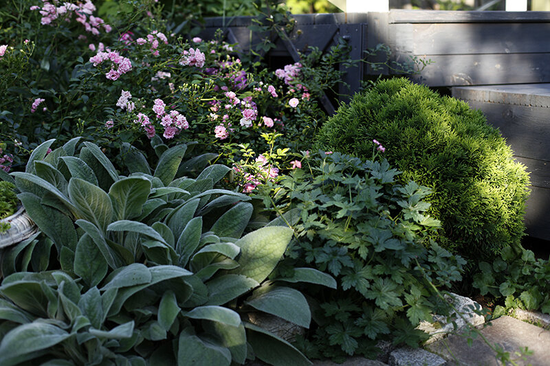 Обычно сад, где есть только цветы, смотрится слишком пестро. Поэтому на цветочные клумбы всегда добавляют растения, которые немного смягчают разноцветье. В Европе это чаще всего самшит - еще и подстриженный в виде кубиков или шаров, он идеально контрастирует с любыми цветами. В нашем климате таким контрастом могут стать шаровидные туи, а также растения, которые всегда вносят прохладу и свежесть на любые клумбы - это растения с серебристой листвой.