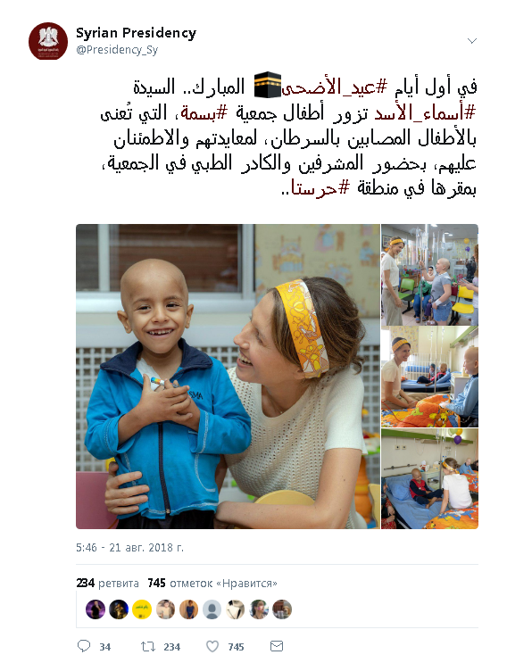 В Курбан-Байрам Первая леди Сирии г-жа Асма Асад посетила детей в онкологическом отделении больницы Берони. Первая леди посетила детей вместе с членами Ассоциации "Басма" - сирийской организации, которая оказывает физиологическую, медицинскую и финансовую поддержку этим детям и их родителям. Саму ассоциацию Басма спонсирует г-жа Асма с 2006. Как отмечается в официальном Твиттре президента Сирийской Арабской Республики, эта работа особенно важна в нынешний период незаконных санкций против сирийской арабской Республики. Г-жа Асма Асад, несмотря на то, что ей самой нужна моральная поддержка из-за того, что она сама лечится от рака, помогала улыбаться этим детям и разделила их горести, их грусть и надежды. подготовил Малюта специально для Стёба ______________________ Предлагаем, тем кто ещё не ..., подписаться на наш журнал "Стёб"©, давайте досмотрим это представление театра абсурда вместе ..