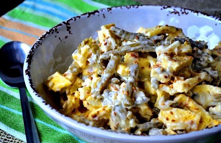 Оригинальный и очень сытный салат можно приготовить с зелёной стручковой фасолью и пышным омлетом. Ингредиенты: - любые специи для овощных блюд (2 г.); - твёрдый сыр любой (165 г.); - сливочный маргарин для жарки (на свой вкус); - стручковая зелёная фасоль (460 г.); - лёгкий майонез (на свой вкус); - чёрные семена кунжута (одна ст. ложка с горкой); - цельное молоко (четыре ст. ложки); - крупное яйцо куриное сырое (четыре штуки). В широкой кастрюле вскипятить отфильтрованную воду, затем добавить в неё необходимое количество стручковой фасоль и варить её примерно пять минут. Далее, стручковую фасоль нужно переложить в дуршлаг и полить холодной водой, после этого её необходимо выложить на бумажное полотенце и полностью высушить. На слабый огонь поставить сковородку, насыпать в неё кунжутные семена и при постоянном помешивании обжарить их всухую, затем подготовить миску, соединить в ней молоко с куриными яйцами, добавить специи, взбить хорошо эти ингредиенты. Перелить яичную смесь на сково