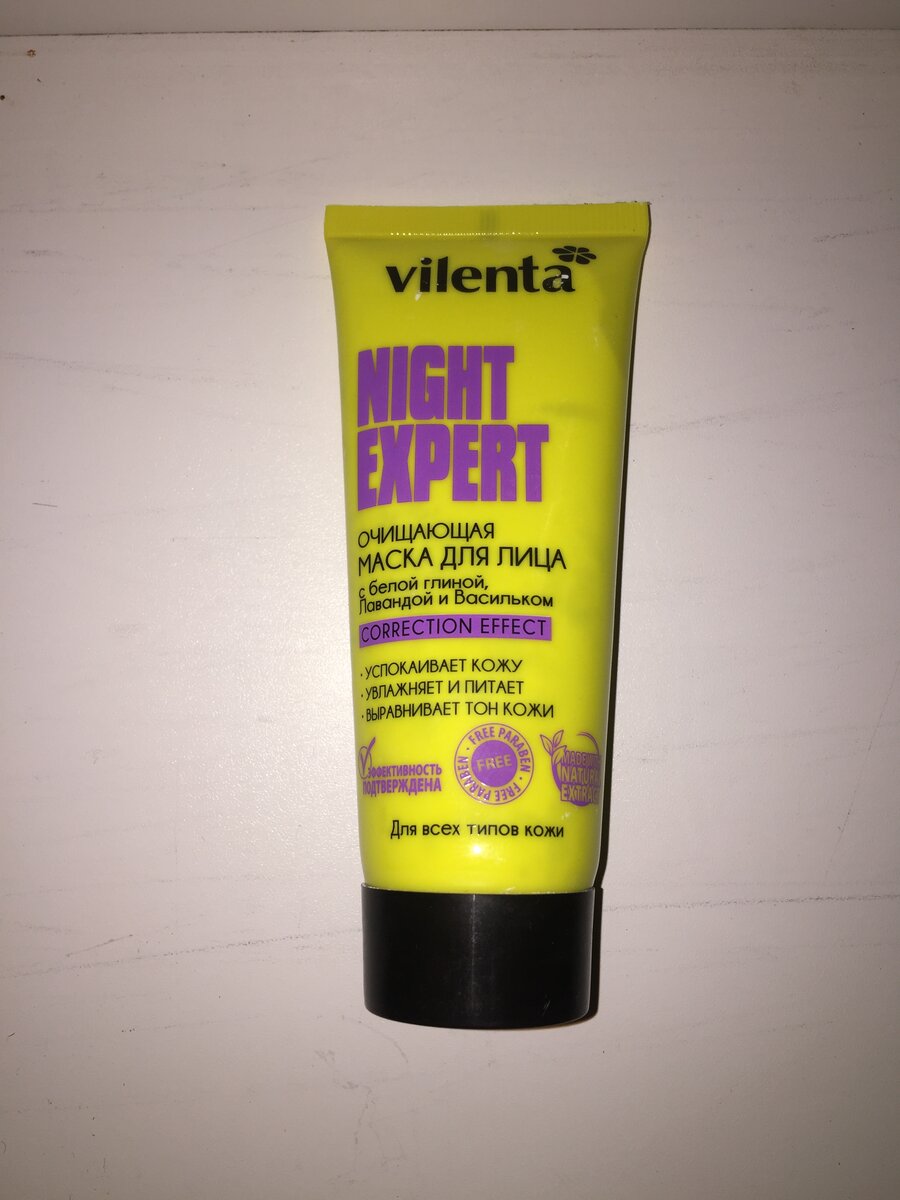 Добрый день! Сегодня я хочу поделиться с вами очищающей маской для вечернего ухода от фирмы Vilenta. Не сказать что я разочарована, но о всех плюсах и минусах читайте в этом обзоре. Вот так она выглядит: В состав входят белая глина, экстракт василька, экстракт лаванды, витамины A, B, E. Полный состав: Объём: 75 мл Покупала я её в аптеке за 130 рублей. Написано, что это маска для вечернего ухода, но думаю её можно делать, когда вам будет удобно. Производитель пишет, что эта маска для всех типов кожи. Запах очень приятный, цветочный. На кожу наносится приятно. По истечении 10 минут маска уже застывает на лице. В описании написано смыть через 20 минут. Настолько же и я оставила её. Спустя 20 минут отправилась смывать. Вот мы и подошли к слабому месту Night Expert. Маска очень хорошо засохла на лице и её приходилось практически вымывать. Я смывала её 15 минут. И была немного шокирована. Какой эффект от маски? Кожа действительно стала светлее, мягче, тон лица выровнялся, поры стали менее