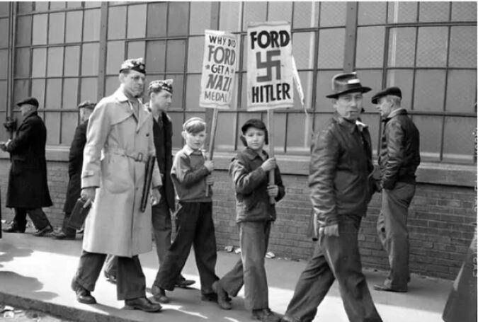 "В США есть один великий человек - Форд, он единственный раздражает евреев своей независимостью." - цитата из книги Адольфа Гитлера "Майн кампф". Генри Форд действительно открыто презирал евреев. Он спонсировал антисемитские выступление в США и содержал газету, которая занималась откровенным антисемитизмом. За некоторые публикации Форду пришлось извиняться, однако образ мыслей менять он не собирался. В 30-ых годах на арене мировой политики появился Адольф Гитлер. Он быстро завоевывает не только любовь народа Германии, но и привлекает более влиятельных людей, в том числе и Генри Форда. Форд начал активно спонсировать партию Гитлера - НСДАП и поощряет нацистскую риторику. После того, как Гитлер приходит к власти, отношения между Генри и Адольфом только крепнут и улучшаются. В 1938 году Генри Форд получает высшую награду Третьего Рейха для иностранцев. После этого Форд открывает несколько заводов в Германии, которые выпускают автомобили для вермахта. Кроме того, он передает Германии нес