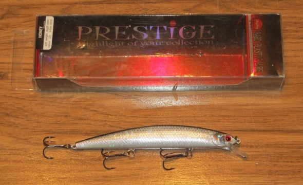 Итак, начну с самого крупного воблерка, это HONEY 130SP в цвете NSY8, натуральный цвет, очень блёсткий, хорош для ловли осенью, в пасмурную погоду. Классический биг-минноу. Размер соответствует заявленному и составляет 130 мм. Имеется модель в нейтральном варианте плавучести. Хоней, как говорит производитель, имеет вес 21 грамм, взвешивание на электронных весах, показало совсем незначительное отклонение в весе на десятые грамма - 21,3 грамма. Покраска хорошая, держится очень хорошо, нет наплывов лака. Проволочный каркас выполнен из относительно толстой, нержавеющей и крепкой проволоки. Воблер оснащен, в принципе, довольно острыми крючками от Owner, с антикоррозионным покрытием черного цвета, заводные кольца довольно крупные, и имеется большая степень свободы крючка.
