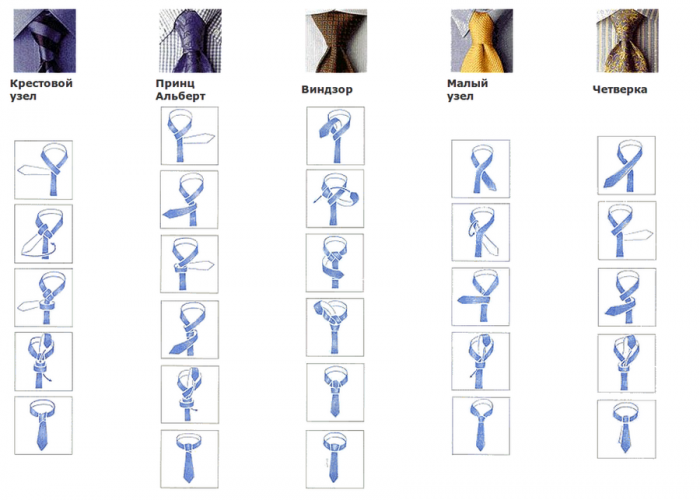 Существует огромное множество галстучных узлов. Способ завязывания напрямую зависит от желаемой формы. Предлагаем вам несколько основных схем.