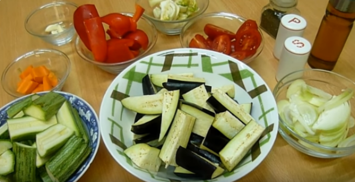В сезон овощей нужно обязательно готовить из них блюда, чтобы пополнить для организма запас витаминов. Из свежих овощей делают салаты. А можно приготовить и гарнир. Сейчас напишу, как это сделать. Овощи для этого блюда могут быть любые, какие есть в холодильнике. Не привязывайтесь к ингредиентному составу, здесь поле для фантазии свободное. Ингредиенты: Запеченные в духовке баклажаны — способ приготовления: 1. Овощи нужно помыть и обсушить или промокнуть насухо салфеткой. Нарезать достаточно крупными кусками. Но размер кусочков может быть любой, в зависимости от Ваших предпочтений. 2. Баклажаны нарежьте и сложите в отдельную миску. Оливковое масло налейте по краю миски и перемешайте. Если лить масло непосредственно на баклажаны, то они сразу же его впитают, и жира понадобится больше. Также посолите баклажаны. 3. Противень смажьте оливковым маслом и выложите баклажаны, кабачки, помидоры, лук и все остальные нарезанные овощи. 4. Посолите и поперчите овощи по вкусу. Посыпьте