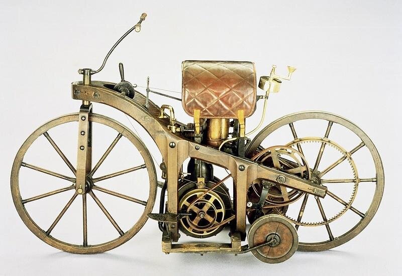 Мотоцикл – это двух или трехколесный транспорт с упорами для ног и вертикальной посадкой, и обязательно с двигателем любого типа. Прапрапредком современного мотоцикла можно назвать образец, собранный в начале девятнадцатого века, который работал на паровом двигателе. Но первый мотоцикл появился значительно позже. Многие придерживаются мнения, что начало истории мотоциклов приходится на 1885 год. Ведь именно в этом году Готлиб Даймлер и Вильгельм Майбах установили двигатель внутреннего сгорания на двухколесный экипаж. Изначально конструкторы не предполагали создавать самостоятельную двигающуюся повозку, для них аппарат играл роль подопытного образца для двигателя, который в последствии планировалось поставить на автомобиль. Выглядел данный агрегат достаточно необычно – деревянный велосипед с бензиновым карбюраторным двигателем всего в полторы лошадиные силы и полукруглым седлом. Передача в данном агрегате была ременной, а двигатель был всего лишь одноцилиндровым с объемом 264 кубич