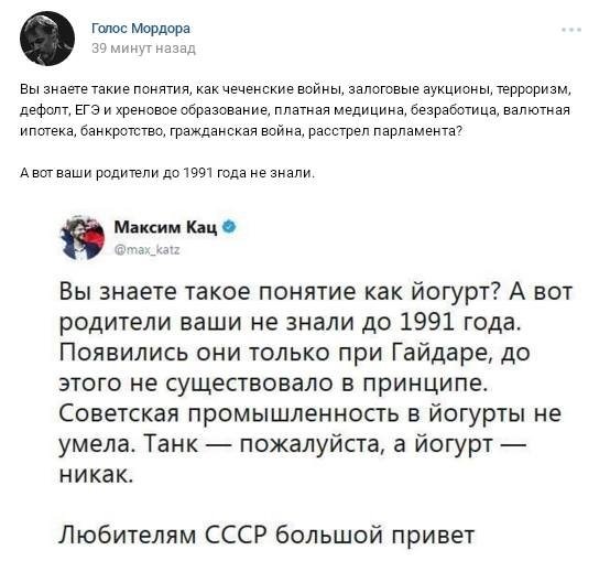 в Йогурт, кто не знал - это только разновидность простокваши. При Гайдаре появилось новое название для традиционного продукта. В СССР молочка была не из сои и пальмового масла, а из натурального коровьего молока - ещё одно отличие помимо названия. Молоко, кефир, простокваша, ряженка, ацидофилин, сметана, сливки, снежок