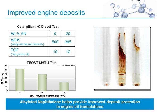 Недавно коллеги из Всероcсийского форума по маслам и смазочным материалам дополнили информацию по алкилированным нафталинам - AN и опубликовали список масел, в которых они точно используются. О свойствах и преимуществах алкилированных нафталинов, в качестве присадочного компонента можно прочитать в статье: Алкилированные нафталины.