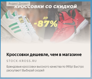 Часть 1, Часть 2, Часть 3 На этот раз уже специально пролистывал ленту в поисках мошеннического сайта на директе, долго искать не пришлось. Вот он Переходим на их сайт и смотрим что же они предлагают нам купить О да кроссы адидас за 990р - у них носки столько стоят. Кроссовки даже со скидкой ниже 3000р я не видел. Заходим на отзовики и смотрим ссылка и ссылка Отзывы как на подбор все отрицательные и все говорят о мошенничестве. Все та же схема с отправкой наложенным платежом, после вскрытия почта назад посылку не принимает. Сайту всего 107 дней и уровень траста ниже плинтуса. В общем Яндексу глубоко наплевать, что рекламировать - главное чтобы баблишко платили.