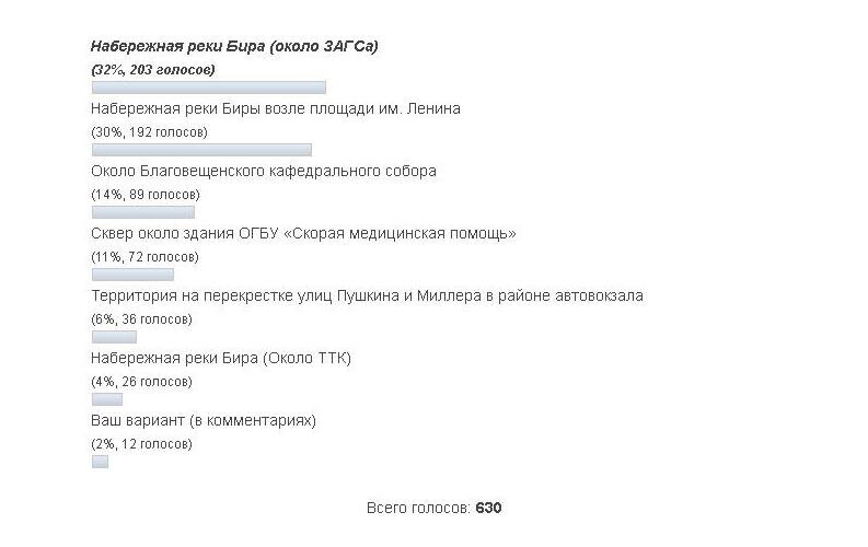 Посетители портала РИА Биробиджан выбрали место для установки памятника Петру и Февронии. Согласно итогам опроса наибольшее количество голосов отданы за набережную реки Бира около ЗАГСа. На портале РИА Биробиджан проходил опрос: «Где в Биробиджане должен быть установлен памятник Петру и Февронии?». На выбор читателям предлагалось семь вариантов ответов: около Благовещенского кафедрального собора, набережная реки Бира (Около ТТК), набережная реки Бира (около ЗАГСа), набережная реки Биры возле площади им. Ленина, сквер около здания ОГБУ «Скорая медицинская помощь», а также территория на перекрестке улиц Пушкина и Миллера в районе автовокзала. Кроме того, в комментариях посетители портала могли предложить свой вариант ответа. Всего в опросе приняло участие 630 человек. Наибольшей популярностью у читателей пользовались варианты «Набережная реки Бира (около ЗАГСа)» и «Набережная реки Биры возле площади им. Ленина». Но в результате голосования победу одержала площадь около Дворца бракосоче